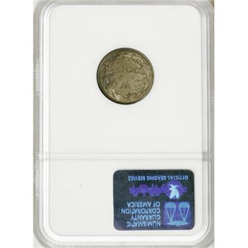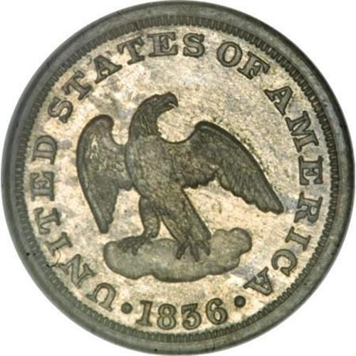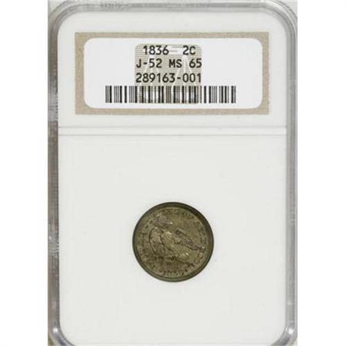 <B>1836 P2C Two Cents, Judd-52, Pollock-55, Low R.6, MS65 NGC.</B></I> An early, small diameter two cent pattern with a spread-winged eagle on the obverse and date below. The reverse features TWO CENTS in the center, surrounded by a laurel wreath. Struck in billon (90% copper, 10% silver), often confused with copper-nickel, and given a reeded edge. Approximately two dozen examples are believed known of this pattern, but we have not offered these at public auction in numbers that support an estimated population that high. Like the coin we offered in our February 2006 Long Beach Auction, NGC has called this piece Mint State. Yet, when we examine the surfaces they appear consistent with a proof striking, including reflective fields. Medallic alignment, the surfaces are toned in streaks of deep gray patina and the piece has an evenly balanced appearance from side to side.<BR><I>From The Madison Collection.</B></I><BR><BR><b>Shipping:</b> Coins & Currency (<a target="_blank" href="http://www.heritageauctions.com/common/shipping.php">view shipping information</a>)