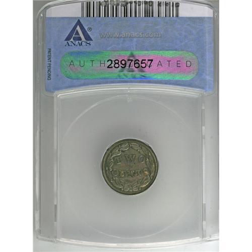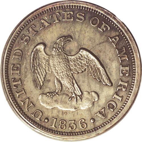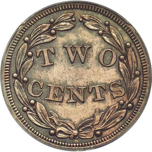 <B>1836<P2C> Two Cents, Judd-54, Pollock-57, Low R.6, PR62 Brown ANACS.</B></I> 1836 was an important year for pattern production. The Gobrecht dollar was introduced, and the first two cent and gold dollar patterns were struck. The obverse of the present piece features a small eagle on a cloud, reminiscent of the Draped Bust silver dollar reverse design. The reverse has TWO CENTS in the center and is surrounded by a laurel wreath. Struck in copper with a plain edge. The dies have medal turn, and a lengthy crack passes through the eagle's right (facing) wing. Sea-green and gold toning dominates the obverse. The reverse has salmon-pink and apple-green patina. Sharply struck with moderately reflective fields.<BR><I>From The Antigo Collection, Part Two.</B></I>
