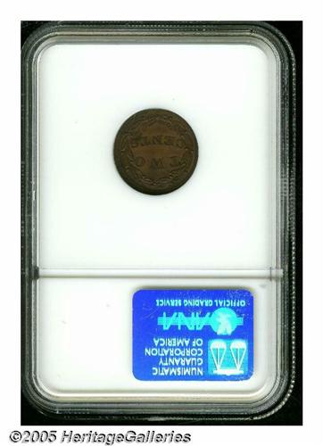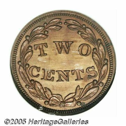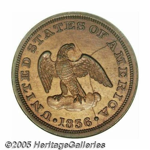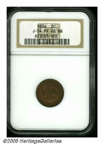 <B>1836<P2C> Two Cents, Judd-54, Pollock-57, Low R.6, PR65 Red and Brown NGC.</B></I> Pattern two cent piece with a spread-winged eagle on the obverse and the date below. The reverse has TWO CENTS in the center and is surrounded by a laurel wreath. Struck in copper with a plain edge and medallic alignment. The obverse design is reminiscent of the 'Small Eagle' motif from early silver coinage. The A in STATES is clumsily repunched over a T. The surfaces are evenly mellowed with most of the original mint red luster still in evidence beneath the light dusting of brown patina.<BR><I>From The Western Hills Collection.</B></I>
