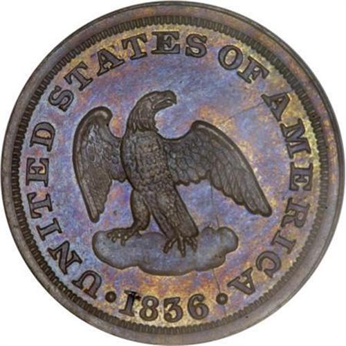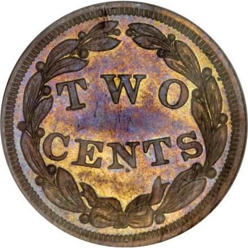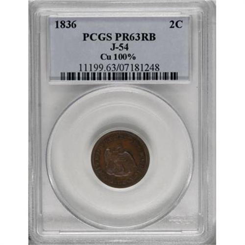 <B>1836 P2C Two Cents, Judd-54, Pollock-57, Low R.6, PR63 Red and Brown PCGS.</B></I> An upright eagle with unfurled wings stands on a cloud, with the date below and UNITED STATES OF AMERICA across the obverse border. The reverse features TWO CENTS in large, curved letters within a laurel wreath. The obverse design is reminiscent of the 'Small Eagle' motif from early silver coinage. Struck with medal turn in copper with a plain edge. The A in STATES is clumsily repunched over a T. Thick (55 to 60 grain) and thin (39 grain) varieties exist, however, the encapsulation prevents a weight measurement. A well struck piece that has beautiful rose, gold, and powder-blue colors. A trio of relatively heavy die cracks (as made) converge on the eagle's right (facing) wing. Population: 2 in 63, 3 finer (11/07).<BR><BR><b>Shipping:</b> Coins & Currency (<a target="_blank" href="http://www.heritageauctions.com/common/shipping.php">view shipping information</a>)