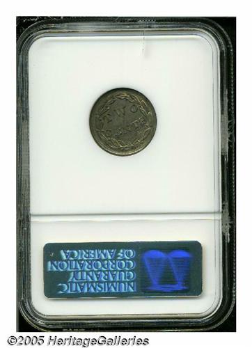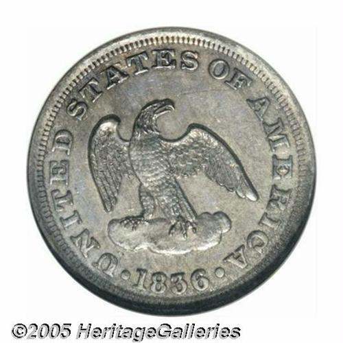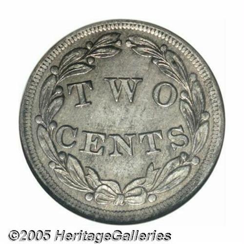<B>1836<P2C> Two Cents, Judd-56A, Pollock-58, R.8, MS63 NGC.</B></I> Two-cent pattern with a spread-winged eagle on the obverse and date below. The reverse shows TWO CENTS in the center, surrounded by a laurel wreath. Struck in white metal with a reeded edge. Both the USPatterns.com website and <I>United States Pattern Coins</B></I> by Judd and edited by Bowers suggests that the white metal pieces are restrikes; however, we aren't certain that is correct as there is no evidence (at least on this piece) of having been struck from a shattered obverse die, as with the pieces that are known to be restrikes from the late 1850s. The surfaces are light gray overall with darker accents over the highpoints on each side. The coin is not especially lustrous, but then that wouldn't be expected from a white metal striking; however, there are no obvious contact marks on either side. A rare opportunity for the pattern specialist.<BR><I>From The Western Hills Collection.</B></I>