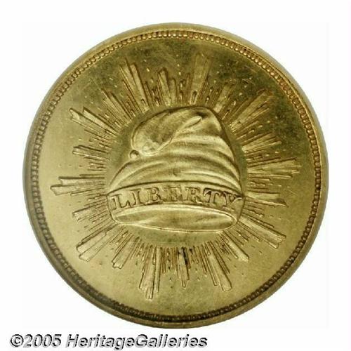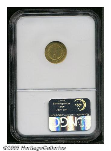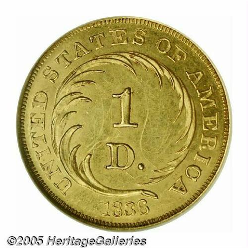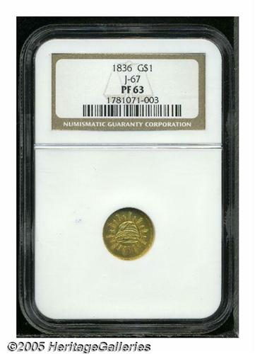 <B>1836<PG$1> Gold Dollar, Judd-67, Pollock-70, R.5, PR63 NGC.</B></I> The obverse features a Liberty cap surrounded by numerous y rays of glory, similar in design to certain contemporary Mexican issues. The reverse features the denomination "1 D." within a coiled palm frond, with the date below and UNITED STATES OF AMERICA above. Christian Gobrecht is credited with both designs. Struck in gold with a plain edge. Judd-67 has considerable historical importance, as it is the first Federal gold pattern as well as the first gold dollar issue. This design was also restruck in the late 1850s, but this piece shows no trace of an undertype or medallic alignment, so we conclude it is an original striking from 1836. Fully struck and deeply mirrored, the only mentionable marks are several shallow scratches around the denomination on the reverse.