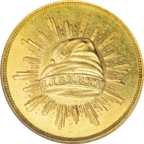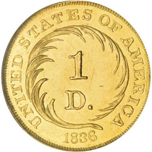 <B>1836 PG$1 Gold Dollar, Judd-67, Pollock-70, R.5, PR63 NGC.</B></I> The obverse features a Liberty cap surrounded by rays of glory, similar in design to certain contemporary Mexican issues. The reverse features the denomination 1 D. within a coiled palm frond, with the date below and UNITED STATES OF AMERICA above. Christian Gobrecht is credited with both designs. Struck in gold with a plain edge. Judd-67 has considerable historical importance, as it is the first Federal gold pattern as well as the first gold dollar issue. This design was also restruck in the late 1850s, but this piece shows no trace of an undertype or medallic alignment, so we conclude it is an original striking from 1836. Fully struck and deeply mirrored, the only mentionable marks are a couple of shallow scratches around the denomination on the reverse.<BR><I>From The Madison Collection.</B></I><BR><BR><b>Shipping:</b> Coins & Currency (<a target="_blank" href="http://www.heritageauctions.com/common/shipping.php">view shipping information</a>)