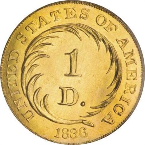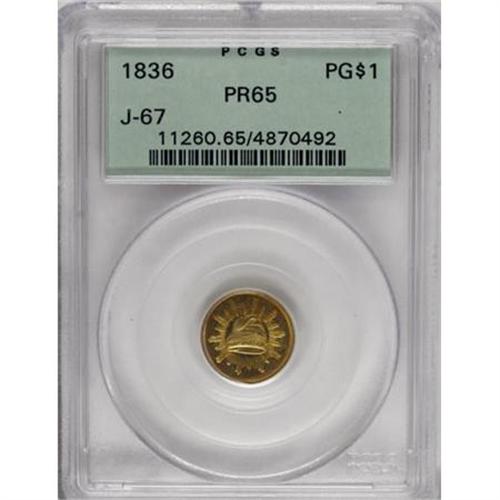 <B>1836 PG$1 Gold Dollar, Judd-67, Pollock-70, R.5, PR65 PCGS.</B></I> Same design, metallic content, and reeded edge as the piece above.<BR> 1836 was a seminal year in American numismatics. The first 1836 Reeded Edge half dollars were struck using the Mint's new steam press, with a "close collar" or "collar die," a die for the edge of the coins. Although the 1836 Reeded Edge half dollars were collected for many years as pattern issues, they are in fact regular circulating issues. Christian Gobrecht completed the working dies for those half dollars. In that same year he also had to interrupt work on the silver dollar designs that would later become known as Gobrecht dollars, to begin work on gold dollar patterns.<BR> The impetus for production of gold dollars was provided by the Bechtlers' private gold coinage in North Carolina and the opening of branch mints in Charlotte and Dahlonega, Georgia, in 1838. A further boost was added by Southern congressmen, who managed to add a clause authorizing gold dollar production to an 1836 bill. Mint Director Robert M. Patterson vehemently opposed such a move, however, while firmly supporting the reintroduction of silver dollar coinage. These 1836-dated patterns are a remnant of the gold-dollar movement. Originals were struck in gold, alloyed with 10% copper. Restrikes exist, in gold and other metals, but both the originals and some of the restrikes were produced in coin turn. The www.uspatterns.com website notes that some restrike gold dollars were believed struck "circa 1859 and possibly later as well," and as confirmation, one restrike is struck over a regular-issue 1859 gold dollar. <BR> This Gem proof example must look much the same as it did when it was made, as it has obviously been preserved with care for several generations. The yellow-gold surfaces show considerable cameo contrast. A curving lintmark to the right of the first T in STATES will serve as a future pedigree identifier. Perusal with a loupe reveals only a few light hairlines on this stunning and historic gold dollar pattern. Certified in a green-label holder.<BR><BR><b>Shipping:</b> Coins & Currency (<a target="_blank" href="http://www.heritageauctions.com/common/shipping.php">view shipping information</a>)
