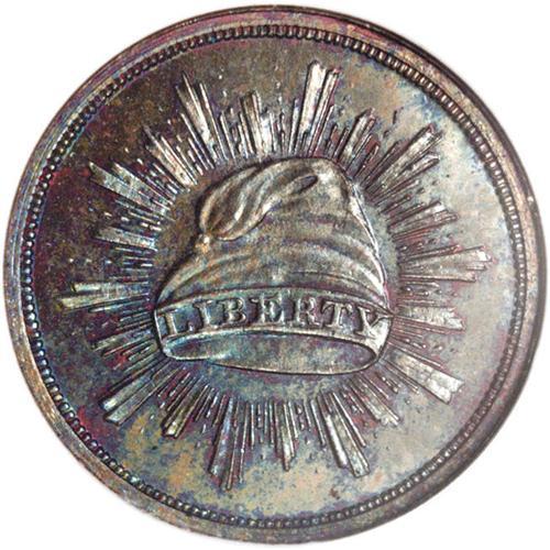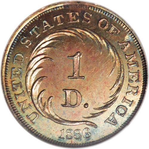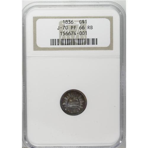 <B>1836 PG$1 Gold Dollar, Judd-70, Pollock-73, Low R.7, PR66 Red and Brown NGC.</B></I> The obverse shows a glory of rays surrounding a cap inscribed LIBERTY. On the reverse a palm branch encircles the denomination 1 D., with the legend UNITED STATES OF AMERICA around and the 1836 date below. Struck in copper with a plain edge.<BR> The gold dollar restrikes, such as the present piece, were made circa 1859 and later. These restrikes--some in medal turn, some in coin turn--were struck in silver, copper, and oroide. The design reflects a similar Cap and Rays design that appeared on Mexican silver coins about 1825.<BR> The present copper restrike specimen offers a blue-green obverse with faded mint red around the periphery; the reverse is golden at the edges, with lilac in the center. Splendid brilliance and good proof contrast are hallmarks of both sides of this historic, interesting, and influential early pattern.<BR><I>From The Jones Beach Collection.</B></I><BR><BR><b>Shipping:</b> Coin/Currency (<a target="_blank" href="http://www.heritageauctions.com/common/shipping.php">view shipping information</a>)