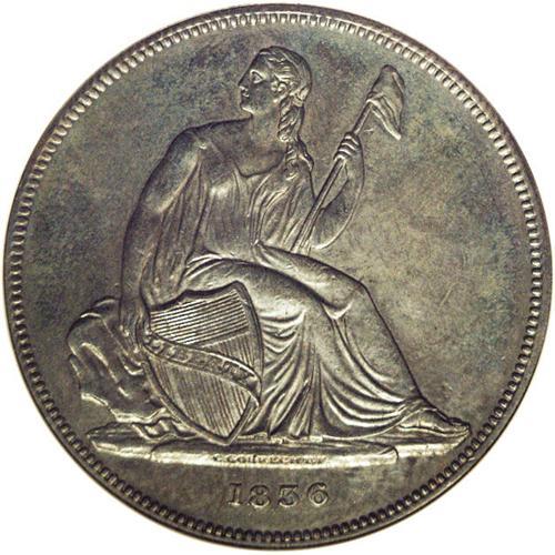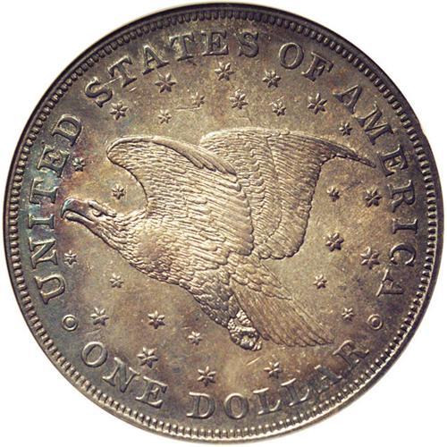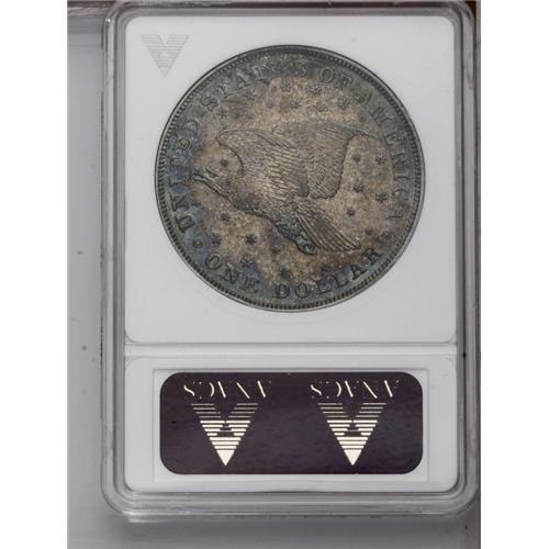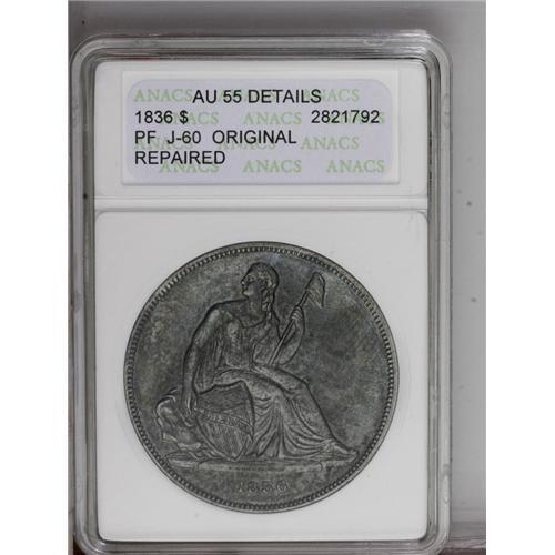 <B>1836<PS$1> Name on Base, Judd-60 Original, Pollock-65, R.1--Repaired--ANACS. AU55 Details.</B></I> Silver. Plain Edge. Die Alignment I. Original Issue of 1836 with the eagle flying upward. Strong magnification shows an apparent faint die scratch above the eagle's wing, pointing toward the AT of STATES. This is the latest and faintest evidence of the die scratch that we have seen. The die scratch places this coin among the 600 pieces produced in late December of that year. The only obvious area of repair that we see is above the foot of Liberty. Otherwise, the surfaces are hairlined and show deep blue-gray toning on the obverse while the center of the reverse is a medium golden-brown. Light friction is also evident over the highpoints.