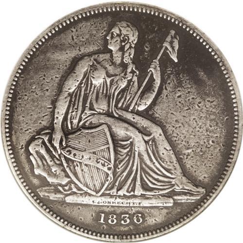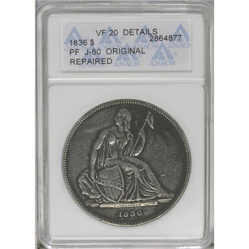 <B>1836<PS$1> Name on Base, Judd-60 Original, Pollock-65, R.1--Repaired--ANACS. VF20 Details.</B></I> Silver. Plain Edge. Die Alignment I. Original Issue of 1836 with the eagle flying upward. We see no evidence of the die scratch above the eagle's wing that survivors from the second striking of 600 coins in December 1836 show; the lack of that die scratch places this coin in the first striking of 400 coins earlier in that same month. While many of these coins are found in high grade, this is an obvious exception. The surfaces are densely peppered with small planchet flaws. In fact, we do not remember seeing another coin of any denomination (including early copper) with as many planchet flaws as this one. Both sides are bright from cleaning with darker accents of color around the margins. The above-mentioned repair(s) are seen in the upper left obverse field, the upper right obverse field, and the lower right reverse field around the eagle's tail feathers. An affordable, entry-level Gobrecht dollar from the first striking period.