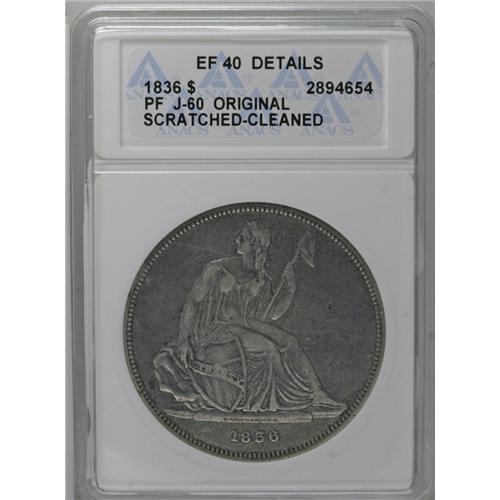 <B>1836<PS$1> Name on Base, Judd-60 Original, Pollock-65, R.1--Scratched, Cleaned--ANACS. XF40 Details.</B></I> Silver. Plain Edge. Die Alignment I (with the eagle flying upward when the coin is rotated along a horizontal axis). This First Original was struck in early December of 1836, as can be seen by the lack of the die scratch above the eagle's wing. There is a shallow, rim-to-rim scratch on the upper obverse with a second scratch that forms an X. Additionally, there are a couple of scratches across the eagle's neck and forepart of the wing. The surfaces also show a number of small planchet flakes on each side. Hairlined, as indicated above, the effects of which are largely unnoticeable by the overlay of medium gray patina and contrasting brilliantish-gray accents over the highpoints. While a great deal of copy has been expended listing this piece's flaws, it is actually much finer in appearance than one might imagine.<BR><I>From The Catfish Creek Collection, Part Two.</B></I>