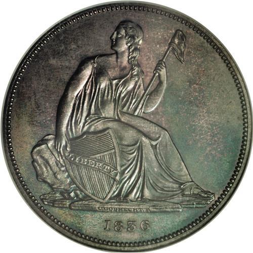 <B>1836 PS$1 Name on Base, Judd-60 Original, Pollock-65, R.1, PR63 NGC.</B></I> Silver. Plain Edge. Die Alignment IV (center of Liberty's head opposite right side of F in OF). In the March 1837 series of dollars (dated 1836, of course), the reverse die slowly rotated. Die Alignment II is the initial orientation and Die Alignment IV the final configuration. Of the 600 pieces reportedly struck in 1837, approximately two-thirds are in Die Alignment IV. These pieces are all known as Second Originals. They all have a medallic turn and show a diagnostic die scratch above the eagle's wing.<BR> This piece has deeply toned surfaces. While primarily rich blue-green, examination under a light also reveals portions of rose and gray coloration. The devices are fully struck in all areas, including Liberty's hair and extended foot as well as all the feathers on the eagle's breast. Lightly hairlined but well concealed by the depth of the toning that covers each side.<BR><BR><b>Shipping:</b> Coin/Currency (<a target="_blank" href="http://www.heritageauctions.com/common/shipping.php">view shipping information</a>)