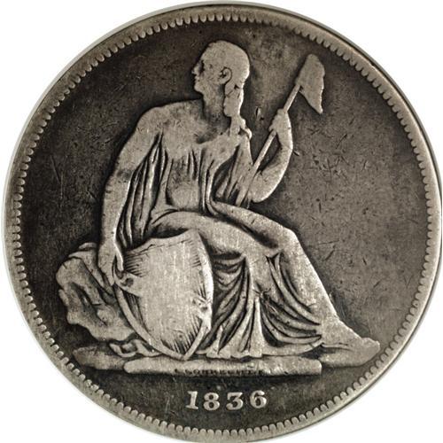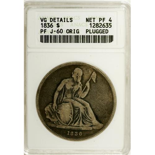 <B>1836 PS$1 Name on Base, Judd-60 Original, Pollock-65, R.1--Plugged--VG Details, Net PR 4 ANACS.</B></I> Silver. Plain Edge. Die Alignment I. Original Issue of 1836 with the eagle flying upward. It does not appear that there is a die scratch above the eagle's wing, which would indicate this is one of the first 400 strikings from early December 1836. Holed in the field between Liberty's head and the Liberty Cap, the plug is fairly smooth on the obverse but crudely done on the reverse with almost none of the O in DOLLAR remaining. Deep charcoal-gray toning covers most of each side with brilliantish highpoints over the design elements.<BR><BR><b>Shipping:</b> Coin/Currency (<a target="_blank" href="http://www.heritageauctions.com/common/shipping.php">view shipping information</a>)