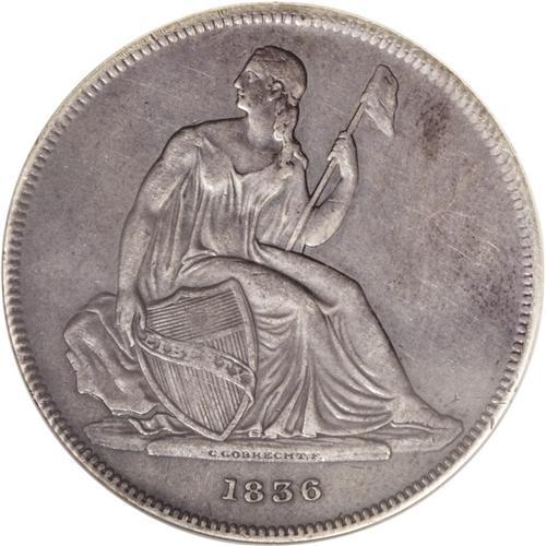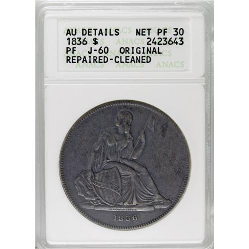 <B>1836 PS$1 Name on Base, Judd-60 Original, Pollock-65, R.1--Repaired, Cleaned--ANACS. AU Details, Net PR30.</B></I> Silver. Plain Edge. Die Alignment I. Original Issue of 1836 with the head of Liberty opposite the O in DOLLAR. We believe this coin is from the first striking period as it does not show a die scratch on the upper reverse. However, we cannot be certain of this as the field has been smoothed in that area. Some smoothing also appears in the left and right obverse fields. While labeled as "Cleaned" the surfaces are also show deep charcoal-gray toning that conceals much of the evidence of cleaning. The surfaces otherwise are attractive.<BR><BR><b>Shipping:</b> Coin/Currency (<a target="_blank" href="http://www.heritageauctions.com/common/shipping.php">view shipping information</a>)