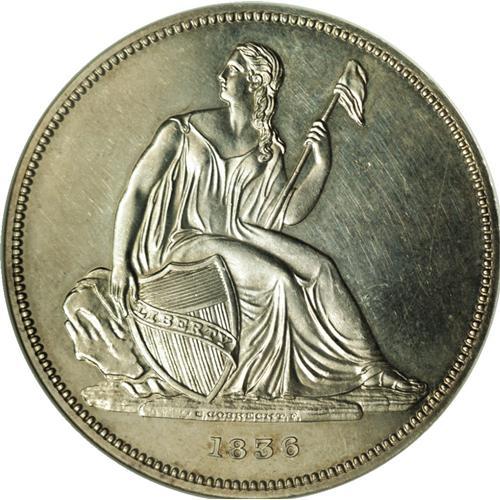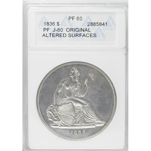 <B>1836 PS$1 Name on Base, Judd-60 Original, Pollock-65, R.1--Altered Surfaces--PR60 ANACS.</B></I> Silver. Plain Edge. Die Alignment IV. A "Second Original" from the March 1837 production run of 600 coins. On this piece, the die scratch over the eagle's wing is obvious, even to the unaided eye. Undoubtedly, this is in part because the coin is largely free from toning and the fields are bright and deeply reflective, making the die scratch easily discernible.<BR> The ANACS insert merely states "Altered Surfaces." For further explanation of this, examine the reverse of the coin. The fields around the periphery have a slight waviness that is not the way the coin came from the Mint. This appears to be the result of heat, but there is no trace of the same effect on the obverse. Nevertheless, this waviness does not impair the arm's length eye appeal of this lovely piece. As stated above, the surfaces are mostly brilliant, but there is also just the slightest trace of golden patina over each side. Fully struck in all areas. The only marks worthy of mention are a short scratch along the jawline of Liberty, and a couple of tiny planchet flakes in the right obverse field below the cap.<BR><I>From The Monedas Oro Collection.</B></I><BR><BR><b>Shipping:</b> Coin/Currency (<a target="_blank" href="http://www.heritageauctions.com/common/shipping.php">view shipping information</a>)