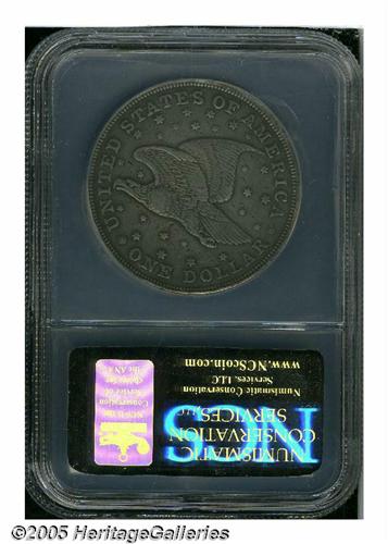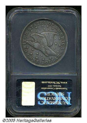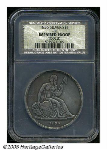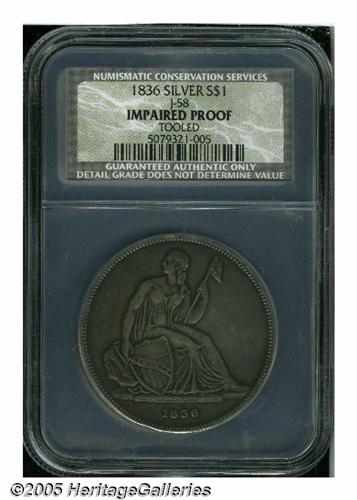 <B>1836<PS$1> Name on Base, Judd-60 Original, Pollock-65, R.1, Impaired Proof, Tooled, NCS.</B></I> Labeled on the insert as a Judd-58, this piece is actually a Judd-60. Silver. Plain Edge. Die Alignment I. Original Issue of 1836 with the eagle flying upward. This First Original is one of the first 400 strikings from early December do not show the die scratch above the eagle's wing. The fields have been lightly tooled and smoothed on each side. The reverse fields contain a number of small planchet flaws. Light to medium gray patina. The coin has the details of an XF40.