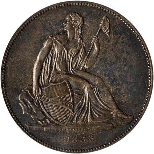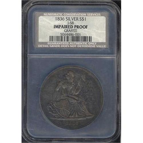 <b>1836 Pattern Dollar. Silver, plain edge. Original. Judd-58. Pollock-61. NCS graded Impaired Proof. Graffiti.</b> Minor pin etching in the fields but still acceptable since the deep toning tends to obscure this and leaves the bold Gobrecht design of the seated Liberty and flying eagle prominently displayed. This is one of the most famous silver dollars of them all. Along with the 1804 and 1895 issues, the beautiful Gobrecht masterpieces have long been favorites with coin collectors, advanced, novices, or in-between. Only about 1,600 pieces were struck of the 1836 issue, a figure that includes some "restrikes" made in 1837 under the new weight standard introduced that year. This is the "original" described in Judd as #58 in his Pattern series, with normal "coin" alignment of the obverse and reverse <b>(PCGS # 11215)</b>