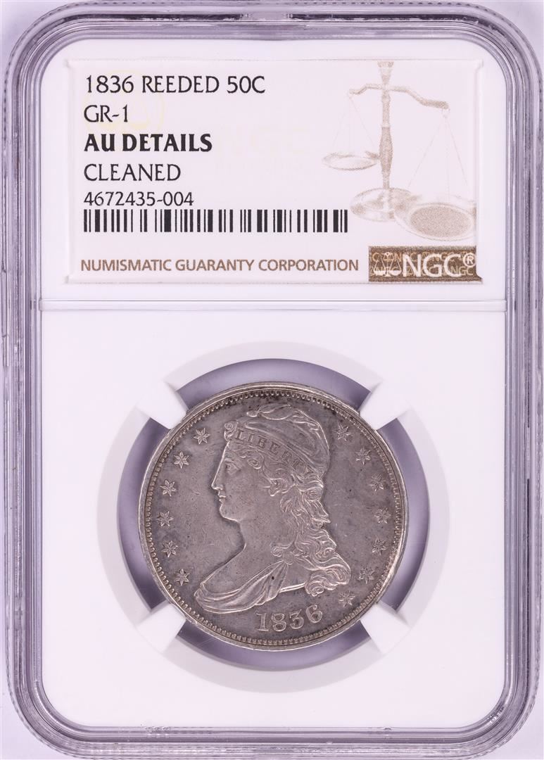 One 1836 Reeded Edge Capped Bust Half Dollar Coin NGC AU Details GR-1. NGC Certified.