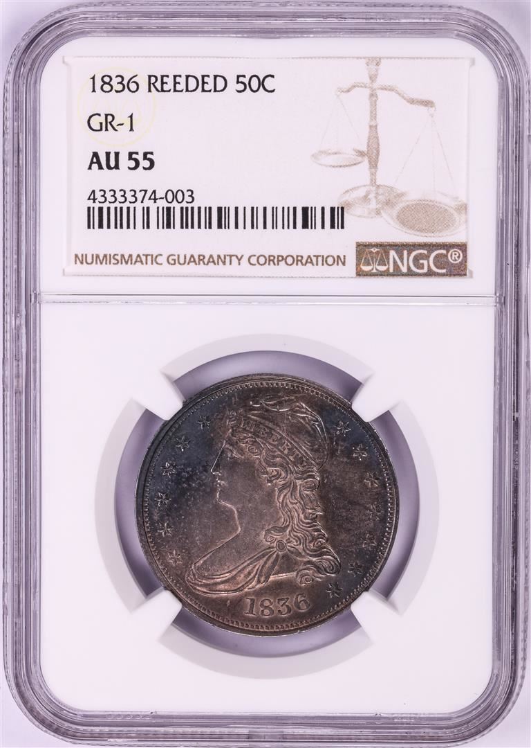 One 1836 Reeded Edge Capped Bust Half Dollar Coin NGC AU55 GR-1. NGC Certified.