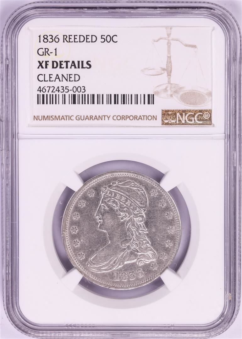 One 1836 Reeded Edge Capped Bust Half Dollar Coin NGC XF Details GR-1. NGC Certified.