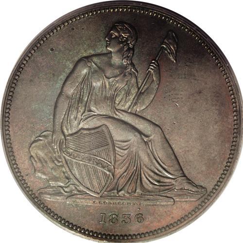 <B>1836 S$1 Name on Base, Judd-60 Original, Pollock-65, R.1, PR53 PCGS.</B></I> Silver. Plain Edge. Die Alignment IV (medallic alignment with the eagle flying level). One of the "Second Original" pieces from March 1837, which are scarcer than the Die Alignment I (coin turn with eagle flying upward) pieces struck in 1836. The die scratch above the eagle's wing is faint, but easily viewed once a loupe is used. This lightly circulated example has rich golden-brown and aquamarine toning. Luster shimmers throughout the devices and legends, and the surfaces show only unimportant marks.<BR><BR><b>Shipping:</b> Coin/Currency (<a target="_blank" href="http://www.heritageauctions.com/common/shipping.php">view shipping information</a>)