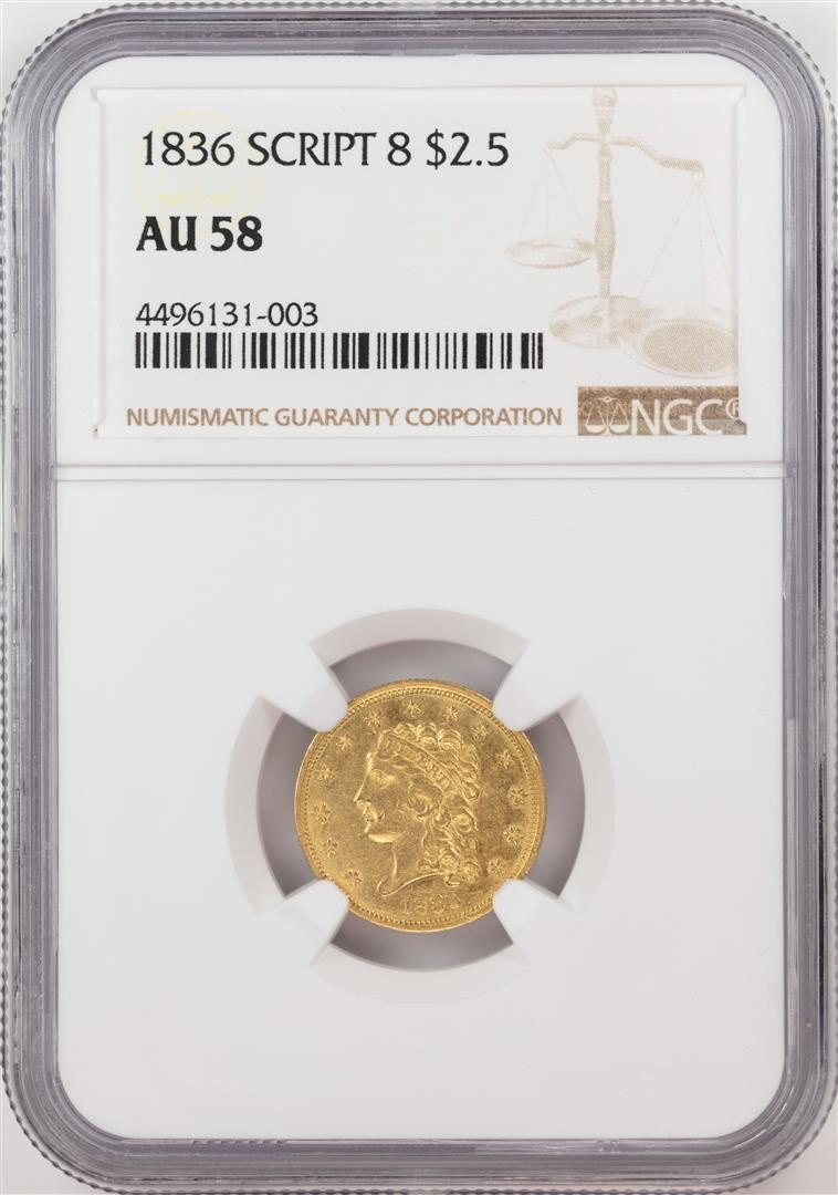 One 1836 Script 8 $2 1/2 Classic Head Quarter Eagle Gold Coin NGC AU58. NGC Certified.