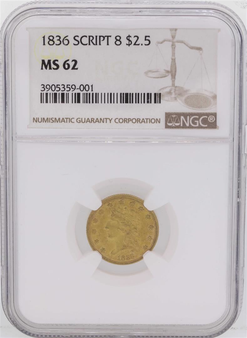 One 1836 Script 8 $2 1/2 Classic Liberty Head Quarter Eagle Gold Coin NGC MS62. NGC Certified.