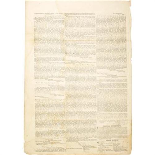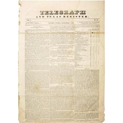 <B>1836</B></I><B><I> Telegraph and Texas Register</B></I></B></I><B>, Vol 1, No. 28</B></I>, four pages, 13.75" x 20.25", Columbia, September 6, 1836. The<I> Telegraph and Texas Register</B></I> was published weekly by Gail and Thomas H. Borden at San Felipe de Austin, beginning in 1835. The official organ of the Republic of Texas, the paper boasted a circulation of 500 by the end of the year. On March 24, 1836, the advance of Santa Anna's troops forced the publishers to move to Harrisburg. Three weeks later, on April 14, the Mexicans plundered the printing office and dumped the press in Buffalo Bayou. That summer, the <I>Telegraph</B></I> was resurrected at Columbia, where the Constitution of the Republic of Texas was published in the first new issue. This September 6 issue features a front-page article by David G. Burnet addressed to "The People of Texas" and focusing on the attack on the press by the Mexican forces. The paper is in near fine condition; with light foxing and browning, and minor chipping at the margins. <I>From the collection of Darrel Brown.</B></I><BR><BR><b>Shipping:</b> Flat Material, Small (<a target="_blank" href="http://www.heritageauctions.com/common/shipping.php">view shipping information</a>)