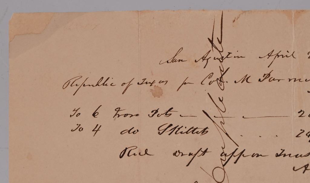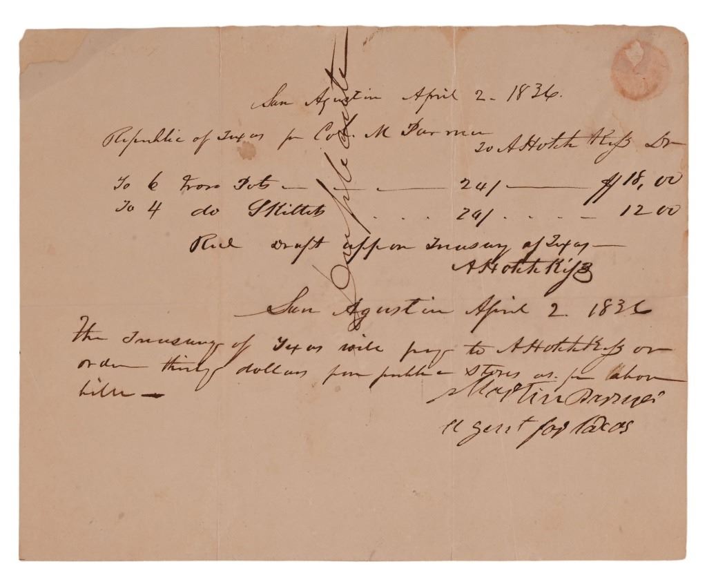Texas Declaration of Independence signer Martin Parmer. this document dated April 2, 1836, San Augustin, Texas. Issuing funds for supplies and labor to A. "Archibald" Hotchkiss. Signed by Martin Parmer, Collector of Taxes. Chairman of the Committee that drafted the Constitution of the Republic of Texas, Parmer signed the Texas Declaration of Independence just one month before issuance of this document. Document measures 6" x 7.5"