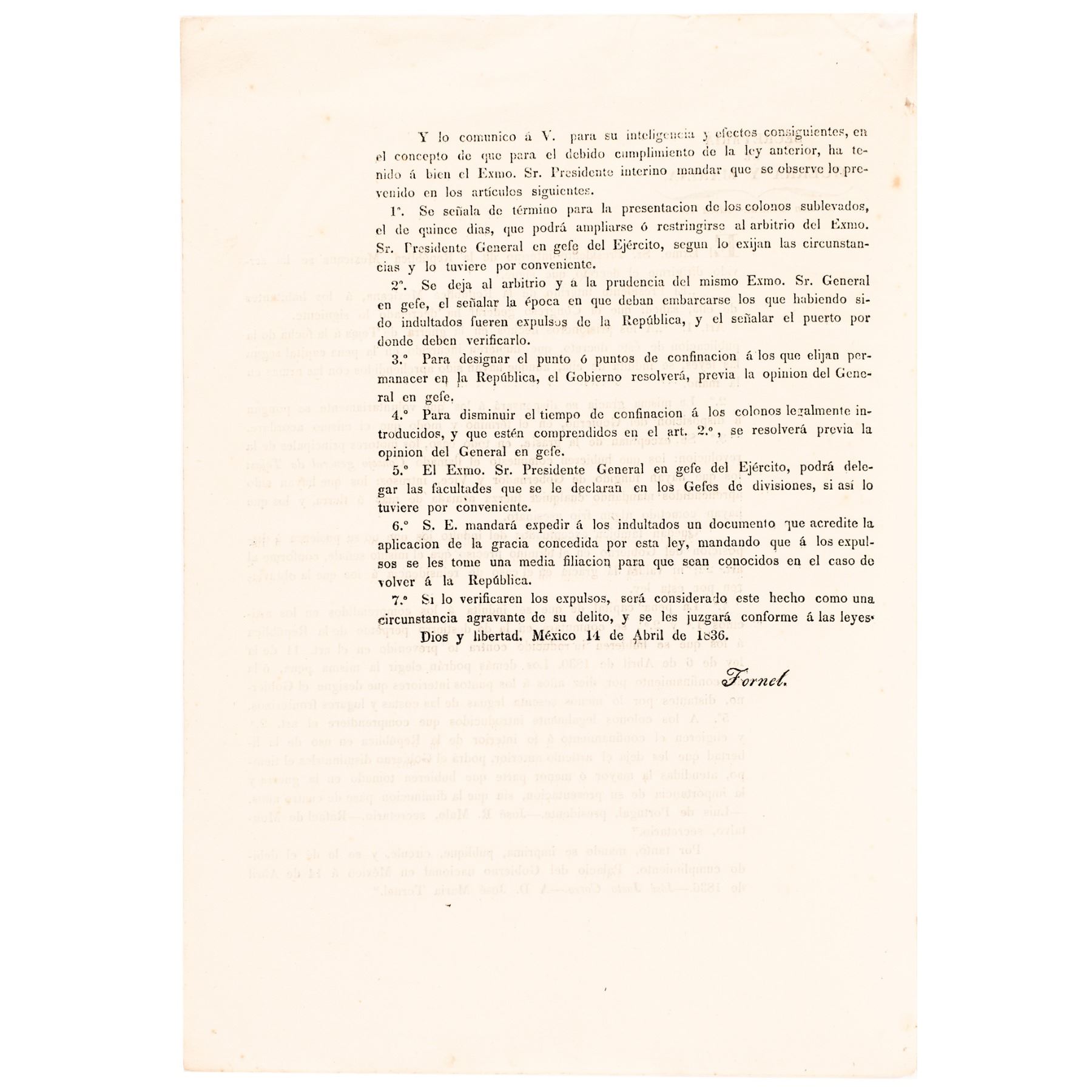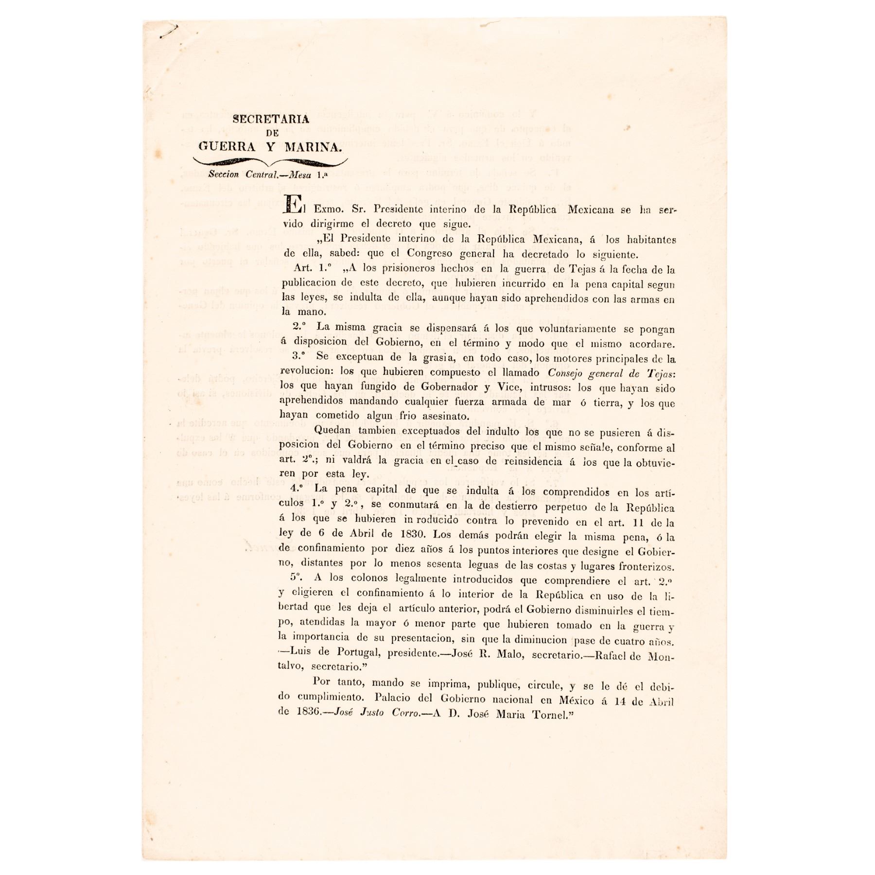 This important Drecree being passed after the Mexican Army victory at the Battle of the Alamo (February 23 - March 6, 1836) a pivotal event in the Texas Revolution. Subsequent events at the Battlefield of San Jacinto a week later than this being issued, on April 21, 1836, would obviate the necessity for such a decree, being the final and decisive battle of the Texas Revolution. Whereby, led by General Samuel Houston, the Texan Army engaged and defeated General Antonio López de Santa Anna's Mexican army in a fight that lasted just 18 minutes. Title from first line of text. With heading: "Secretaria de Guerra y Marina. Seccion Central.-Mesa 1.a." Dated and type-signed at end: "Me´xico 14 de abril de 1836. Tornel."