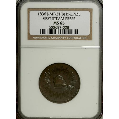 <B>1836 U.S. Mint First Steam Coinage MS65 NGC.</B></I> Julian-MT-21. Copper. Glossy mahogany-brown with hints of iridescent toning over full cartwheel luster. The surfaces are pristine with no noticeable marks on either side. This piece is from the original die with MAR. 23 punched over FEB. 22.<BR><BR><b>Shipping:</b> Coins & Currency (<a target="_blank" href="http://www.heritageauctions.com/common/shipping.php">view shipping information</a>)