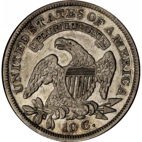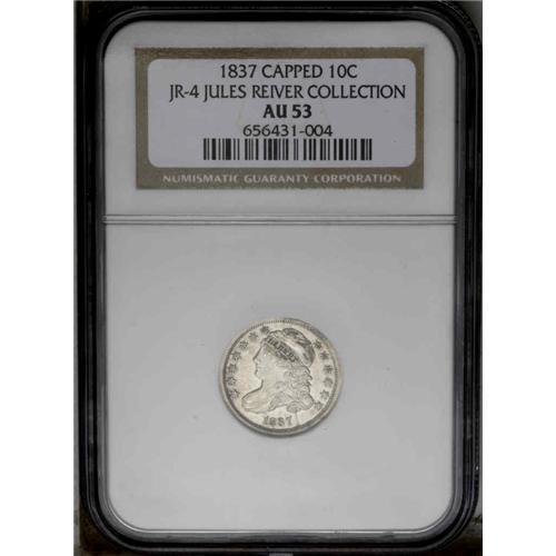 <B>1837<10C> JR-4, R.1. Reiver state b. AU53 NGC.</B></I> Light silver with a splash of dark gold on the top of Liberty's head and cap, with traces of luster found in the protected areas. The obverse has a bisecting die crack which is right of the date up through the E of LIBERTY to the rim through the cap. No reverse die cracks are present. Clean surfaces for the grade.<BR><I>Ex: Classic Coins (circa 1982).</B></I> Envelope Included.