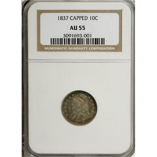 <B>1837 10C AU55 NGC.</B></I> NGC Census: (5/92). PCGS Population (14/60). Mintage: 359,500. Numismedia Wsl. Price for NGC/PCGS coin in AU55: $346. (#4529)<BR><BR><B>Coin Engraver:</B> John Reich<BR><BR><b>Shipping:</b> Coins & Currency (<a target="_blank" href="http://www.heritageauctions.com/common/shipping.php">view shipping information</a>)