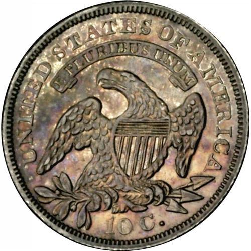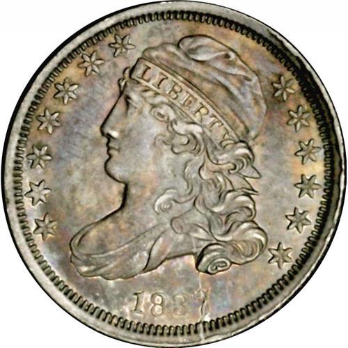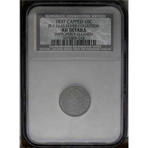 <B>1837<10C> JR-3, R.2. Reiver die state c.--Improperly Cleaned--NCS. AU Details.</B></I> Darkly retoned with gray, gold, russet and red and not very attractive. The surfaces and strike are excellent, and clearly display the short die crack up through the 7 to Liberty's drapery. A couple of neck nicks on Liberty reside below her ear and there are a couple of shallow hits on the reverse. A later die state than usually encountered.<BR><I>Ex: Vinci (January 1992).</B></I> Envelope Included.