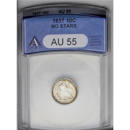 <B>1837<10C> Large Date AU55 ANACS.</B></I> Primarily untoned centers give way to concentric shades of amber and sea-green peripheral toning. An appealing representative of the short-lived No Stars design.