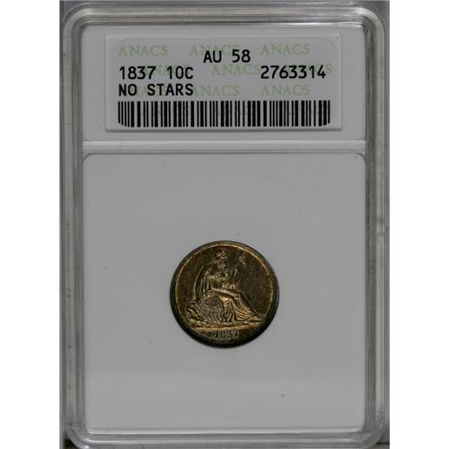 <B>1837<10C> Large Date AU58 ANACS.</B></I> The devices are bathed in luster, and the golden-brown toning is attractive. Faint marks above ONE are barely worthy of mention. A lovely No Stars type coin.<BR><I>From The Chief Paduke Collection.</B></I>