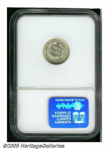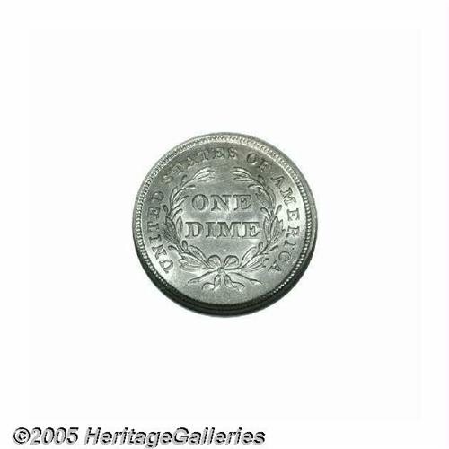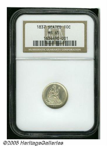 <B>1837<10C> Large Date MS65 NGC.</B></I> Faint gold color endows this lustrous and gorgeous Gem. Exceptionally preserved and intricately struck. 1837 Half Dimes are not rare, but they are diverse in design and variety. The Philadelphia Mint struck the Seated, No Stars subtype only in 1837. A relatively early die state, the recutting on the base of the 7 is present, and only the right half of the familiar pie-shaped die crack is present. Population: 20 in 65, 23 finer (6/05).