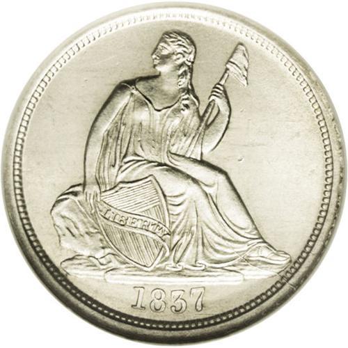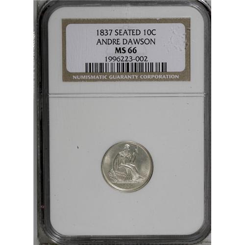 <B>1837<10C> Large Date MS66 NGC.</B></I> Ex: Andre Dawson Collection. An untoned example of this exceptional, yet simply designed one-year type coin. The satiny surfaces are basically untoned and the devices fully struck with no mentionable abrasions on either side. Struck from a later state of the dies as evidenced by the pie-shaped wedge of a die crack on the lower obverse. About 20 degrees of clockwise die rotation is noted. Census: 20 in 66, 6 finer (7/06).