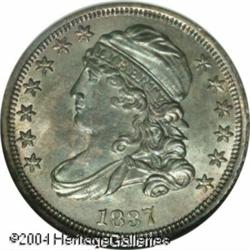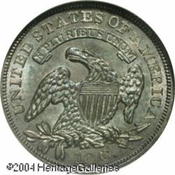 1837 10C MS66 NGC. JR-3, R.2. While this variety i <B>1837 10C MS66 NGC.</B></I> JR-3, R.2. While this variety is fairly easy to locate above XF with the occasional Mint State example even available, this coin must undoubtedly be at the top of the Condition Census for the variety. The surfaces are bright and lustrous with a semi-reflective appearance to the fields. Each side is overlaid by a lovely layering of thalo-blue with occasional dabs of rust coloration around the margins. Just the slightest bit of highpoint weakness can be detected with a magnifier. Only nine other pieces have been so graded by both of the major services (four PCGS and five other by NGC) with none finer at either service (11/04). <BR><BR><B>Important notice:</B> Heritage usually auctions material at the rate of 200-250 lots per hour. On some occasions eBay Live bid software or the Internet may not be able to keep up with the pace of the auction. We recommend placing a realistic absentee bid now as insurance to avoid disappointment. Occasionally the auctioneer may eliminate or reject an eBay Live bid, and the auctioneer may also reopen a lot after the close of the eBay live bidding (usually because we missed an audience bid), and may reject your bid even if it shows you as the winning bidder. By bidding via eBay Live, you agree that Heritage may award the lot to another bidder at its sole discretion under the circumstances described above or any other reasonable circumstances. Since eBay bids are not shown to us until we open the lot on the floor, we treat those bids just like floor bids. In most cases the floor responds before the eBay bid is presented to us, due to Internet lag time, so for consistency we have made it a policy that floor bids are always considered first over tie eBay live bids. Also please note that all Heritage lots purchased through eBay Live carry a 20% Buyer's Premium. Please make sure you read the Terms and Conditions before you bid. This lot is being auctioned in conjunction with a live floor auction by Heritage Galleries & Auctioneers. All final auction and invoice information will be supplied by Heritage Galleries & Auctioneers, and all other information should be considered preliminary. Lot:5707