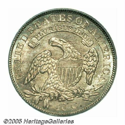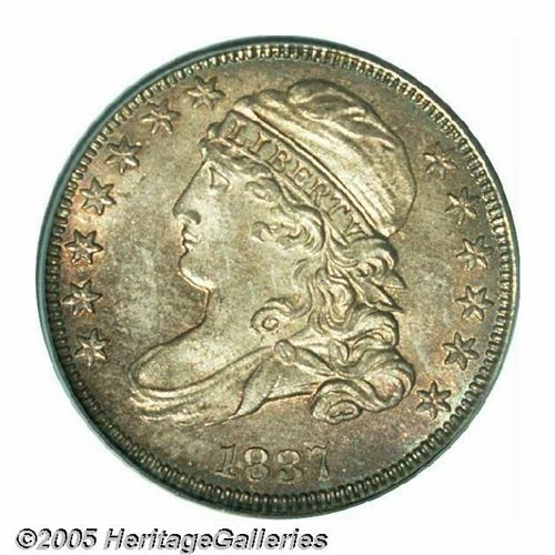 <B>1837<10C> MS66 PCGS.</B></I> JR-3, R.2. The Block 8 in the date and a low F in OF identify the variety. The final year of the type; Liberty Seated Dimes were also produced in 1837. This lovely example displays light reddish-gold patina in the centers, framed by a narrow ring of cobalt-blue around the peripheries. Lustrous surfaces display sharply defined motifs, and are well preserved. A couple of trivial marks on Liberty's cheek are not at all offensive, and are mentioned solely for accuracy. Population: 4 in 66, 0 finer (6/05).<BR><I>From The Melrose Bay Collection.</B></I>