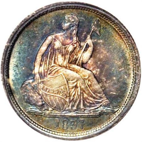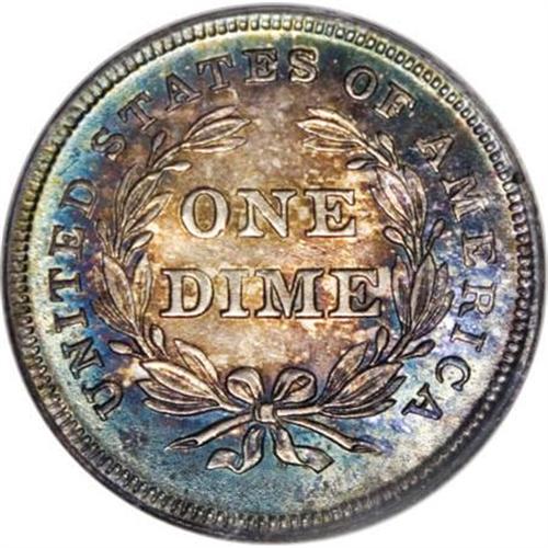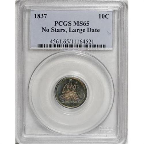 <B>1837 10C No Stars, Large Date MS65 PCGS.</B></I> Fortin-101b. This year saw the changeover from the Capped Bust dimes to the Liberty Seated dimes, whose No Stars Obverse type was produced only through 1838 (New Orleans only). The 1838 No Stars further resolves into Small and Large Date varieties, of which the Small Date is slightly more elusive, yet both coins carry significant premiums due to their popularity both as a unique design and a two-year type coin. The present example offers the pie-shaped obverse die cracks characteristic of this variety, along with the reverse die rotated clockwise 23 degrees. Deep aqua and pinkish-gray toning appears on each side, with few abrasions.<BR><BR><B>Coin Engraver:</B> Christian Gobrecht<BR><BR><b>Shipping:</b> Coins & Currency (<a target="_blank" href="http://www.heritageauctions.com/common/shipping.php">view shipping information</a>)
