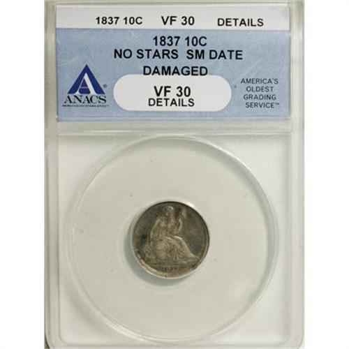 <B>1837 10C No Stars, Large Date--Damaged--ANACS. VF30 Details.</B></I> NGC Census: (9/292). PCGS Population (11/290). Mintage: 682,500. Numismedia Wsl. Price for NGC/PCGS coin in VF30: $305. (#4561)<BR><BR><B>Coin Engraver:</B> Christian Gobrecht<BR><BR><b>Shipping:</b> Coins & Currency (<a target="_blank" href="http://www.heritageauctions.com/common/shipping.php">view shipping information</a>)