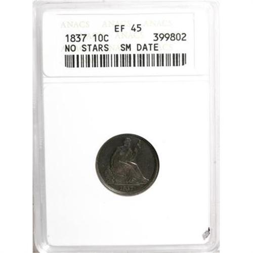 <B>1837 10C No Stars, Large Date XF45 ANACS.</B></I> NGC Census: (13/259). PCGS Population (19/241). Mintage: 682,500. Numismedia Wsl. Price for NGC/PCGS coin in XF45: $462. (#4561)<BR><BR><B>Coin Engraver:</B> Christian Gobrecht<BR><BR><b>Shipping:</b> Coins & Currency (<a target="_blank" href="http://www.heritageauctions.com/common/shipping.php">view shipping information</a>)