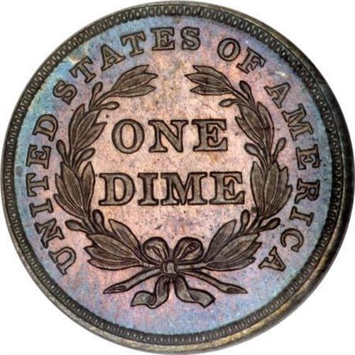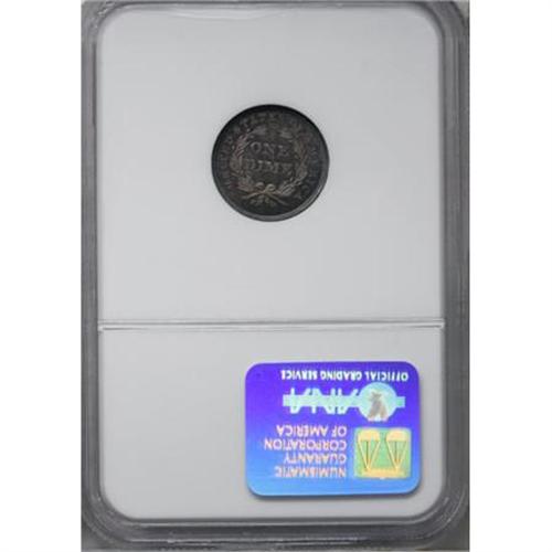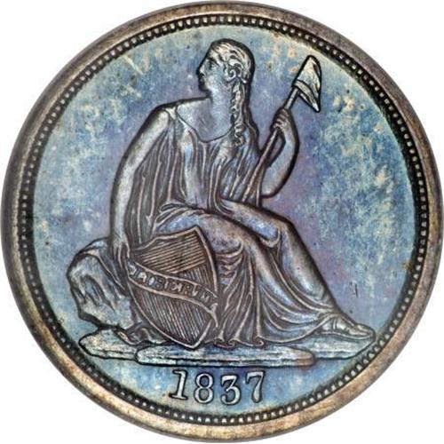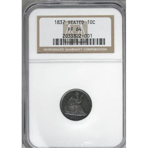<B>1837 10C No Stars PR64 NGC.</B></I> The 1837 dime is quite valuable in proof format. It is of the Large Date variety, which has a flat top to the 3. It also displays a spur from the rim over the first T in STATES.<BR> Walter Breen, in his 1989 <I>Encyclopedia of United States and Colonial Proof Coins</B></I>, says 30-plus 1837 proofs were struck on June 30, 1837, with "possibly 20 seen in all, some badly cleaned." NGC and PCGS have, to date, graded a total of 41 pieces from PR60 to PR67, an unknown number of which are obviously resubmissions.<BR> Low-intensity cobalt-blue patina dominates the obverse of this near-Gem, which shows a splash of light purple in the center. The latter color covers most of the reverse, with cobalt-blue concentrating at the margins. The strike is uniformly crisp, befitting a proof impression, leaving no elements with even the slightest hint of weakness. A few minute obverse handling marks are all that keep this lovely example from full Gem classification. Census: 11 in 64, 5 finer (11/07).<BR><BR><b>Shipping:</b> Coins & Currency (<a target="_blank" href="http://www.heritageauctions.com/common/shipping.php">view shipping information</a>)