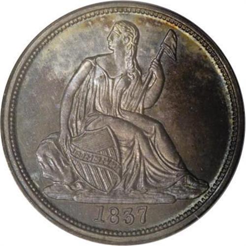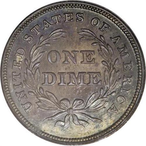 <B>1837 10C No Stars PR65 PCGS.</B></I> Large Date. A key proof subtype, since the No Stars Liberty Seated design was only struck in proof during 1837. In his 1988 Encyclopedia, Breen states "some 30 brilliant proofs were struck for presentation to Treasury officials and other VIPs" on June 30, 1837. Those proofs can be identified by a die line from a denticle above the left half of the first T in STATES, and also by recutting on the base of the 7 in the date. Mark Borckardt adds that all proofs he has seen have an identical die rotation of 200 degrees, slightly clockwise from coin turn.<BR>This lovely Gem has dusky powder-blue, yellow-green, and plum-mauve toning. The strike is penetrating, even on Liberty's hair and the dentils. Careful rotation under a light fails to locate grade-limiting imperfections. Population: 2 in 65, 1 finer (8/07).<BR><BR><b>Shipping:</b> Coins & Currency (<a target="_blank" href="http://www.heritageauctions.com/common/shipping.php">view shipping information</a>)
