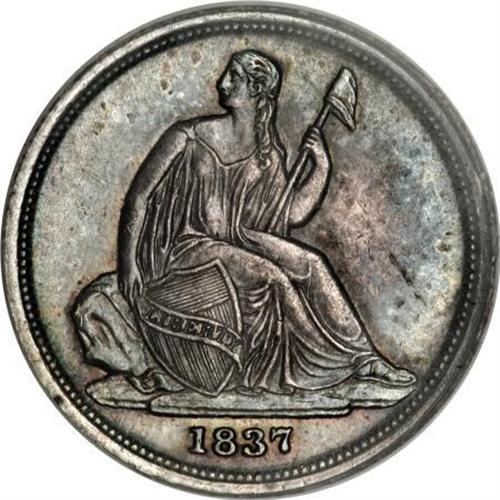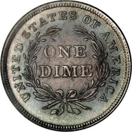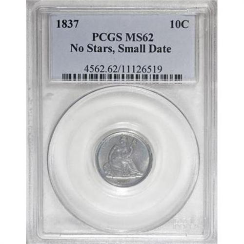<B>1837 10C No Stars, Small Date MS62 PCGS.</B></I> A very clean and original example of this brief two-year type. The strike is bold and the luster is satiny and fully pleasing, with deep rose-gray toning in the centers, circled by lovely sea-green coloration closer to the borders. Die clash marks are noticeable on the reverse, but both sides of the piece seem nearly blemish-free and the overall look certainly approaches Select.<BR><BR><B>Coin Engraver:</B> Christian Gobrecht<BR><BR><b>Shipping:</b> Coins & Currency (<a target="_blank" href="http://www.heritageauctions.com/common/shipping.php">view shipping information</a>)