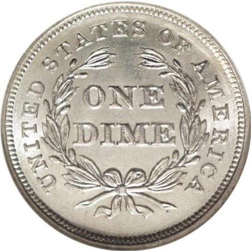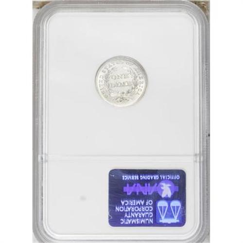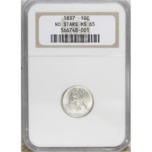 <B>1837 10C No Stars, Small Date MS65 NGC. CAC.</B></I> Unlike the 1837 No Stars half dime, the dime Small and Large dates obviously differ in size. Judging by Heritage auction appearances, the Small Date appears to be moderately scarcer, at least in Mint State. This is a brilliant and satiny Gem that boasts a mark-free appearance.<BR><BR><B>Coin Engraver:</B> Christian Gobrecht<BR><BR><b>Shipping:</b> Coins & Currency (<a target="_blank" href="http://www.heritageauctions.com/common/shipping.php">view shipping information</a>)