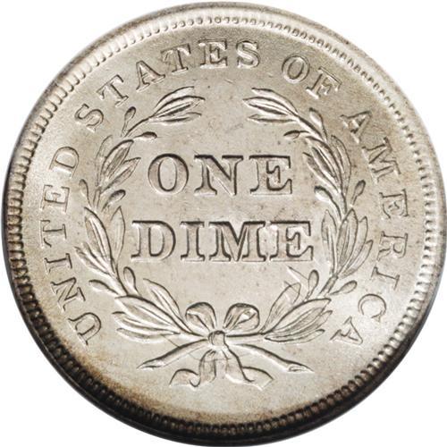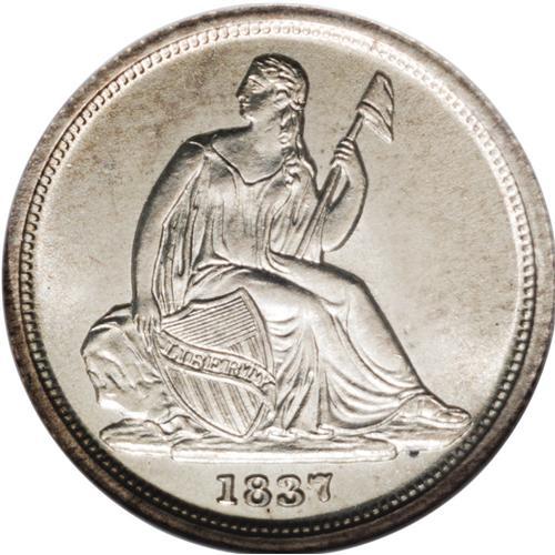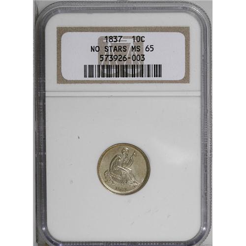 <B>1837<10C> Small Date MS65 NGC.</B></I> The Small and Large Date 1837 Seated half dime logotypes are actually similar in size, and are thus misnomers. However, the 1837 Seated dime Small and Large Date varieties differ dramatically. It is more difficult to determine which is scarcer, since third party grading services often label both varieties as No Stars, which distinguishes them from the Capped Bust dimes struck the same year. The <I>Guide Book</B></I> prices the Small Date higher across all grades, although the difference is relatively small. The 1837 Small Date is available in Mint State, but Gems are desirable as an ephemeral subtype. Presumably, stars were left off the first Seated hub because they did not transfer well from the hub to the working die. This gently toned and thoroughly lustrous Gem is boldly impressed and splendidly smooth. Even the most demanding collector is certain to be pleased.