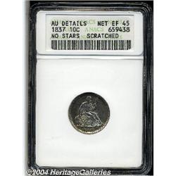 <B>1837<10C> Small Date--Scratched--ANACS. AU Details, Net XF45.</B></I> Golden-brown and sea-green patina embraces this bold No Stars Dime. Much luster is present, although a couple of pinscratches in the right obverse field require mention.<BR><I>From The Dr. Gary Hogg Collection.</B></I> <BR><BR><B>Important notice:</B> Heritage usually auctions material at the rate of 200-250 lots per hour. On some occasions eBay Live bid software or the Internet may not be able to keep up with the pace of the auction. We recommend placing a realistic absentee bid now as insurance to avoid disappointment. Occasionally the auctioneer may eliminate or reject an eBay Live bid, and the auctioneer may also reopen a lot after the close of the eBay live bidding (usually because we missed an audience bid), and may reject your bid even if it shows you as the winning bidder. By bidding via eBay Live, you agree that Heritage may award the lot to another bidder at its sole discretion under the circumstances described above or any other reasonable circumstances. Since eBay bids are not shown to us until we open the lot on the floor, we treat those bids just like floor bids. In most cases the floor responds before the eBay bid is presented to us, due to Internet lag time, so for consistency we have made it a policy that floor bids are always considered first over tie eBay live bids. Also please note that all Heritage lots purchased through eBay Live carry a 20% Buyer's Premium. Please make sure you read the Terms and Conditions before you bid.