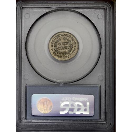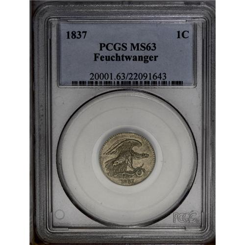 <B>1837<1C> Feuchtwanger Cent MS63 PCGS.</B></I> Low-120, HT-268, Breen 5-H, R.1. The satiny gray surfaces show a number of carbon specks that limit the grade. Well, but not fully struck. An impressive Uncirculated example of this experimental coin. <BR><BR><B>Important notice:</B> Heritage usually auctions material at the rate of 200-250 lots per hour. On some occasions eBay Live bid software or the Internet may not be able to keep up with the pace of the auction. We recommend placing a realistic absentee bid now as insurance to avoid disappointment. Occasionally the auctioneer may eliminate or reject an eBay Live bid, and the auctioneer may also reopen a lot after the close of the eBay live bidding (usually because we missed an audience bid), and may reject your bid even if it shows you as the winning bidder. By bidding via eBay Live, you agree that Heritage may award the lot to another bidder at its sole discretion under the circumstances described above or any other reasonable circumstances. Since eBay bids are not shown to us until we open the lot on the floor, we treat those bids just like floor bids. In most cases the floor responds before the eBay bid is presented to us, due to Internet lag time, so for consistency we have made it a policy that floor bids are always considered first over tie eBay live bids. Also please note that all Heritage lots purchased through eBay Live carry a 20% Buyer's Premium. Please make sure you read the Terms and Conditions before you bid. This lot is being auctioned in conjunction with a live floor auction by Heritage Galleries & Auctioneers. All final auction and invoice information will be supplied by Heritage Galleries & Auctioneers, and all other information should be considered preliminary. Lot:5389 <BR><BR><B>Winning Notification and Billing:</B> After the FINAL session in this auction is complete, Heritage will send e-mail and snail mail invoices. This process normally takes several days. All final auction and invoice information will be supplied by Heritage Galleries & Auctioneers, and all other information should be considered preliminary. <BR><BR>This auction will be conducted on a live auction floor and over the Internet through eBay Live. If you choose to place an absentee bid, please take a moment to <font color='#0000ff'><u><a href='http://pages.ebay.com/liveauctions/help/before/laabsentee.html'>learn how eBay Live absentee bidding works</a></u></font><font color='#000000'>