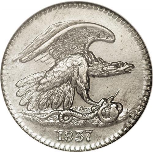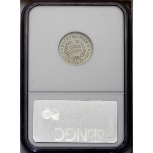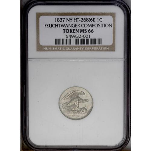 <B>1837<1C> Feuchtwanger Cent MS66 NGC.</B></I> Low-120, HT-268, Breen 6-I, R.1. A stunning Gem, one of the finest we have seen or handled. Essentially fully struck, or as full as ever for these pieces. The surfaces have highly lustrous pale gray color with satiny texture. Mint State Feuchtwanger cents are not particularly rare, except in Gem and finer quality, with few surviving examples. <BR><BR><B>Important notice:</B> Heritage usually auctions material at the rate of 200-250 lots per hour. On some occasions eBay Live bid software or the Internet may not be able to keep up with the pace of the auction. We recommend placing a realistic absentee bid now as insurance to avoid disappointment. Occasionally the auctioneer may eliminate or reject an eBay Live bid, and the auctioneer may also reopen a lot after the close of the eBay live bidding (usually because we missed an audience bid), and may reject your bid even if it shows you as the winning bidder. By bidding via eBay Live, you agree that Heritage may award the lot to another bidder at its sole discretion under the circumstances described above or any other reasonable circumstances. Since eBay bids are not shown to us until we open the lot on the floor, we treat those bids just like floor bids. In most cases the floor responds before the eBay bid is presented to us, due to Internet lag time, so for consistency we have made it a policy that floor bids are always considered first over tie eBay live bids. Also please note that all Heritage lots purchased through eBay Live carry a 20% Buyer's Premium. Please make sure you read the Terms and Conditions before you bid. This lot is being auctioned in conjunction with a live floor auction by Heritage Galleries & Auctioneers. All final auction and invoice information will be supplied by Heritage Galleries & Auctioneers, and all other information should be considered preliminary. Lot:5392 <BR><BR><B>Winning Notification and Billing:</B> After the FINAL session in this auction is complete, Heritage will send e-mail and snail mail invoices. This process normally takes several days. All final auction and invoice information will be supplied by Heritage Galleries & Auctioneers, and all other information should be considered preliminary. <BR><BR>This auction will be conducted on a live auction floor and over the Internet through eBay Live. If you choose to place an absentee bid, please take a moment to <font color='#0000ff'><u><a href='http://pages.ebay.com/liveauctions/help/before/laabsentee.html'>learn how eBay Live absentee bidding works</a></u></font><font color='#000000'>
