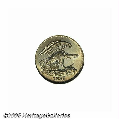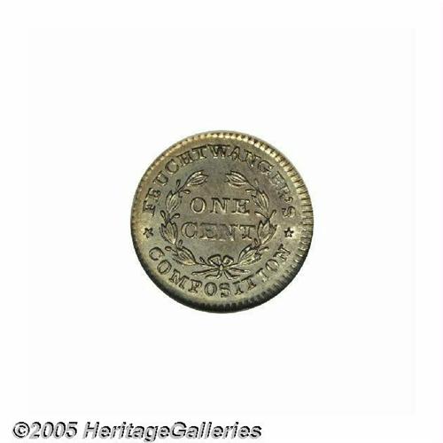 <B>1837<1C> Feuchtwanger Cent MS67 NGC.</B></I> Low-120, HT-268, Breen 6-I, R.1. Lovely powder-blue, peach, and yellow-gold hues endow this lustrous and magnificently preserved Superb Gem. The surfaces do not show any planchet streaks or laminations that often plague this popular Hard Times issue. A bit soft on the EN in CENT, as always for the type, due to metal flow to the very high relief eagle's body on the opposite side.
