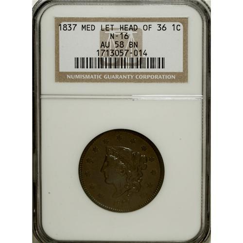 <B>1837 1C Medium Letters, Head of 1836 AU58 NGC.</B></I> N-16. NGC Census: (94/648). PCGS Population (24/146). Mintage: 5,558,300. Numismedia Wsl. Price for NGC/PCGS coin in AU58: $183. (#1729)<BR><BR><b>Shipping:</b> Coins & Currency (<a target="_blank" href="http://www.heritageauctions.com/common/shipping.php">view shipping information</a>)
